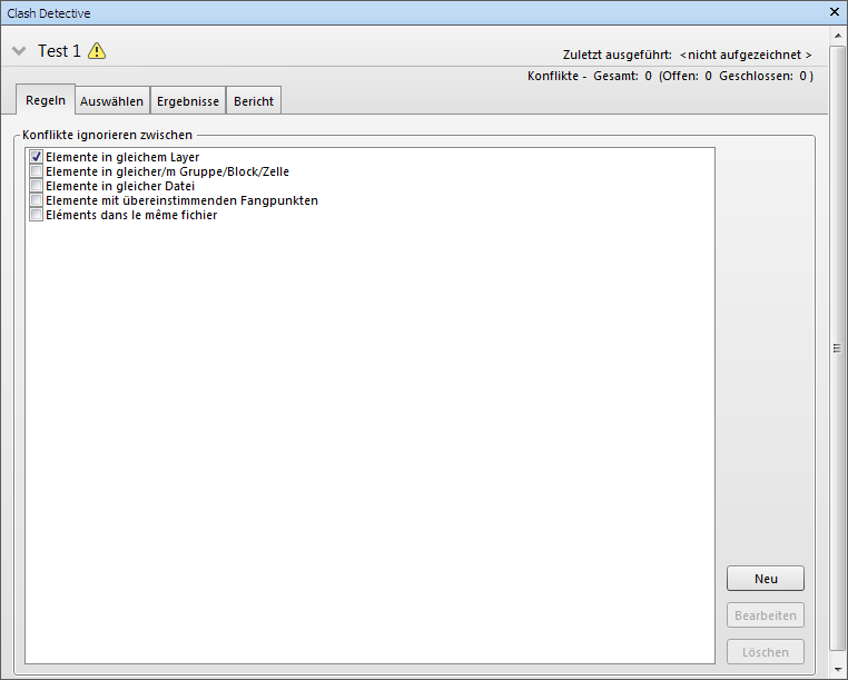 Regeln können Sie die für Konflikttests angewendeten Ignorierungsregeln definieren und anpassen. Alle aktuell verfügbaren Regeln werden aufgelistet. Sie können verwendet werden, wenn
