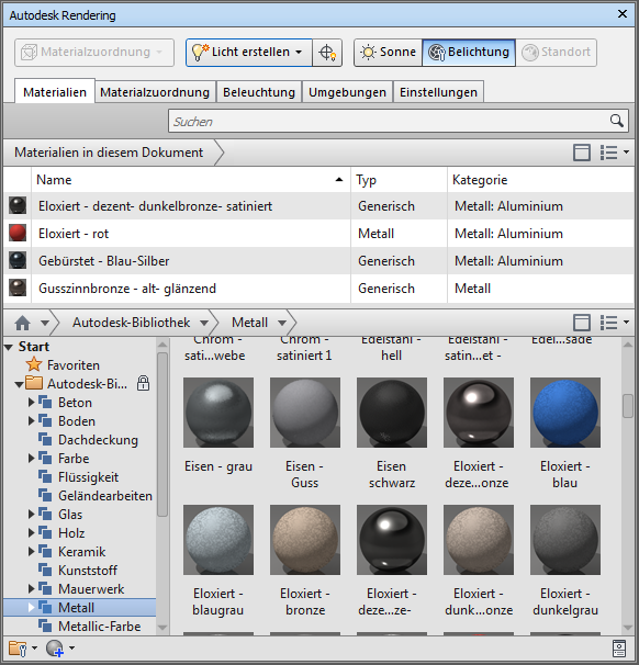 Sie können Materialbibliotheken von Autodesk verwalten oder benutzerdefinierte Bibliotheken für bestimmte Projekte erstellen. Mithilfe der Filter-Schaltflächen können Sie die angezeigten Materialien, die Größe der Miniaturansichten und die Menge der angezeigten Informationen ändern.
