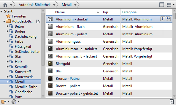 - Favoriten In dieser speziellen Benutzerbibliothek ist die Sammlung der benutzerdefinierten Materialien gespeichert. Diese Bibliothek kann nicht umbenannt werden.