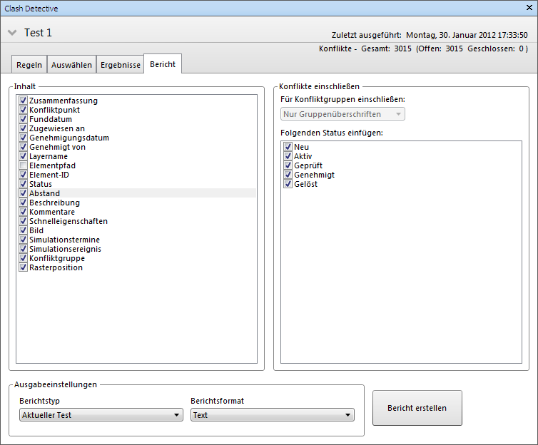 6. Wählen Sie im Feld Konflikttypen einschließen die Konfliktergebnisse aus, die im Bericht berücksichtigt werden sollen.