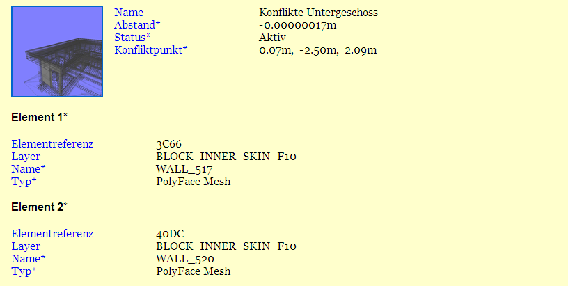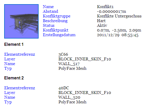 • Anmerkung: Zum Anpassen der Darstellung oder des Layouts der HTML- oder tabellarischen HTML-Datei müssen Sie die Datei clash_report_html.xsl / clash_report_html_tabular.xsl bearbeiten. Die installierte Datei befindet sich im Unterverzeichnis Stylesheets des Installationsverzeichnisses von Autodesk Navisworks. Sie können die bearbeitete Datei in das Unterverzeichnis Stylesheets eines beliebigen Autodesk Navisworks-Suchverzeichnisses kopieren. Weitere Informationen finden Sie unter Suchverzeichnisse.