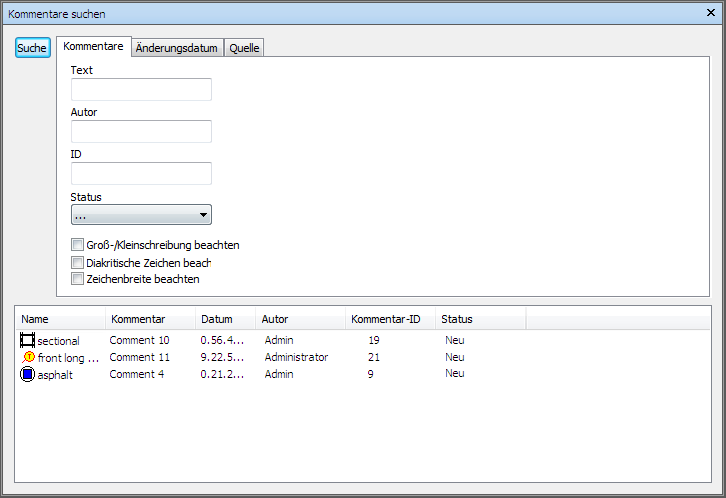 Mithilfe der drei Registerkarten am oberen Rand legen Sie die Suchkriterien fest. Klicken Sie auf Suchen, um die Suche auszuführen. Die Suchergebnisse werden in einer mehrspaltigen Tabelle am unteren Rand des Fensters aufgelistet. Mit den Bildlaufleisten rechts und unten auf der Registerkarte gehen Sie die Kommentare durch. Mithilfe unterschiedlicher Symbole können Sie das Quellelement jedes einzelnen Kommentars auf den ersten Blick feststellen. Diese Symbole sind dieselben, die auch im Fenster Kommentare zum Einsatz kommen.