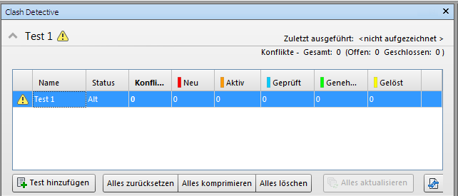 Eine Zusammenfassung des aktuell ausgewählten Konflikttests wird stets oben im Clash Detective-Fenster angezeigt. Die Gesamtzahl der im Test aufgeführten Konflikte wird zusammen mit Details zu geöffneten (Neu, Aktiv, Überprüft) und geschlossenen (Bestätigt, Gelöst) Konflikten behoben. Wenn ein Konflikttest seit seiner Einrichtung in irgendeiner Weise geändert wurde (indem z. B. eine Option geändert oder die neueste Version des Modells geladen wurde), bedeutet dies, dass die Ergebnisse unter Umständen nicht das aktuelle Modell oder die aktuellen Einstellungen wiedergeben. In diesem Fall wird eine Warnung angezeigt
