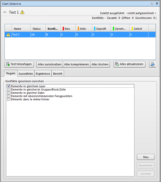 Im fixierbaren Fenster Clash Detective können Sie die Regeln und Optionen für Konflikttests einrichten, Ergebnisse anzeigen, sie sortieren und Konfliktberichte erstellen.