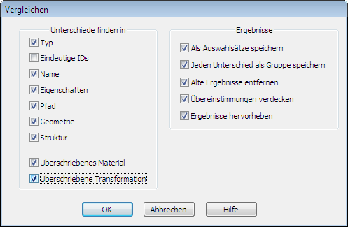 • Als Auswahlsätze speichern: Speichert die verglichenen Elemente als Auswahlsatz. Diese Gruppe können Sie später für einen erneuten Vergleich der beiden Elemente wieder heranziehen.