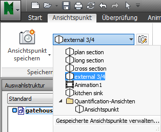 Klicken Sie auf der Registerkarte Ansichtspunkt auf die Gruppe Speichern, laden und wiedergeben, und wählen Sie dann in der Dropdown-Liste Gespeicherte Ansichtspunkte den zu überprüfenden Ansichtspunkt aus.