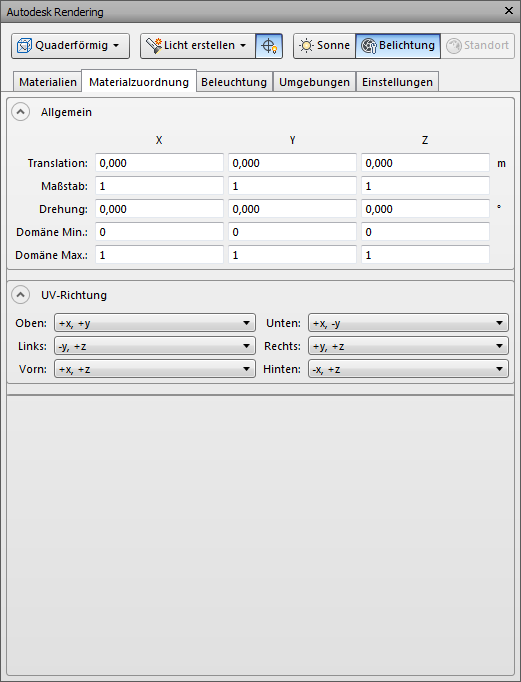 Verwenden Sie die Registerkarte Materialzuordnung, um die Vorgabeeinstellungen für den im Werkzeugkasten ausgewählten Typ der Materialzuordnung anzupassen. Diese Funktion wird nur für erfahrene Benutzer empfohlen.