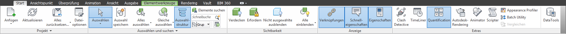 Die Multifunktionsleiste ist in Registerkarten unterteilt, von denen jede eine bestimmte Aktivität unterstützt. Innerhalb jeder Registerkarte sind die Werkzeuge in aktivitätsbasierten Gruppen organisiert. Manche der Registerkarten sind kontextabhängig. Wenn Sie bestimmte Befehle ausführen, wird anstelle eines Werkzeugkastens oder Dialogfelds eine kontextabhängige Multifunktionsleisten-Registerkarte eingeblendet. Beispiel: Sobald Sie mit der Auswahl von Elementen in der Szenenansicht beginnen, wird die zuvor ausgeblendete Registerkarte Elementwerkzeuge angezeigt. Wird keine Auswahl getroffen, wird sie wieder ausgeblendet.