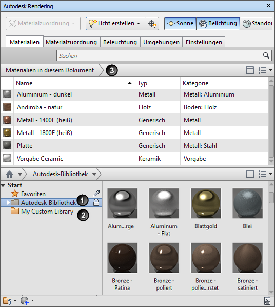 1 - Autodesk Library. Enthält vordefinierte Materialien zur Verwendung durch Autodesk-Anwendungen, die Materialien unterstützen. Die von Autodesk bereitgestellten Bibliotheken sind gesperrt, wie durch ein Sperrsymbol angegeben. Sie können die Autodesk-Bibliothek zwar nicht bearbeiten, können diese Materialien jedoch als Basis für benutzerdefinierte Materialien verwenden, die Sie in der Benutzerbibliothek speichern können.