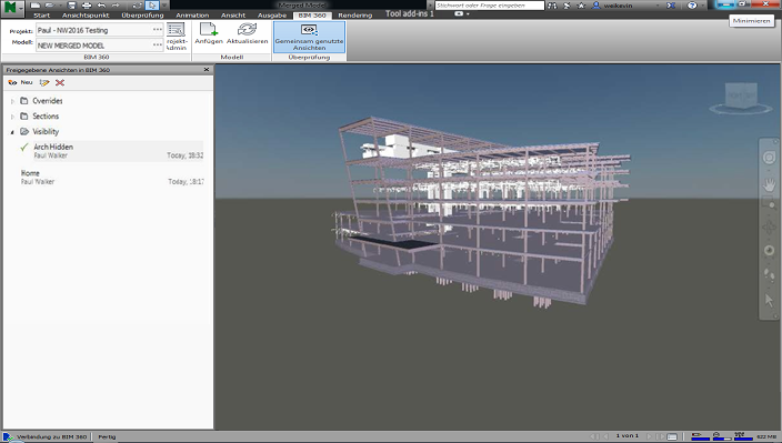In Navisworks können Modelle oder zusammengeführte Modelle aus BIM 360 geladen werden. Alle Änderungen, die Sie an diesen Modellen in Navisworks vornehmen, können in BIM 360 wieder als zusammengeführtes Modell gespeichert werden. Diese Änderungen werden beibehalten, wenn das zusammengeführte Modell in Navisworks und anderen Navisworks-Clients angezeigt wird. Wenn Sie jedoch das zusammengeführte Modell in BIM 360 öffnen, sind nicht alle Navisworks-spezifischen Daten sichtbar. Nur die Navisworks-Definition für das zusammengeführte Modell wird von Navisworks und BIM 360 gemeinsam genutzt; sie besteht aus: