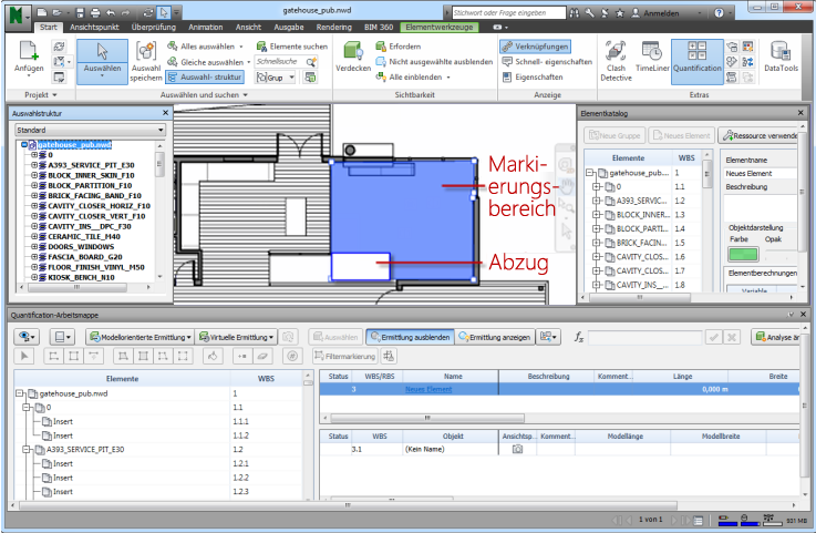 Schneiden von Geometrieteilen mit der Abzug-Funktion. Wenn Sie ein Werkzeug für Abzug zeichnen, schließen Sie damit einen Teil eines vorhandenen Flächen-Objekts aus. Werkzeuge für Abzüge sind nützlich, wenn Sie beispielsweise eine Fußbodenfläche markiert haben, einen Teil dieses Bereichs wie z. B. den Flur jedoch von der Markierung ausschließen möchten. Die Abzugsfläche für den Flur wird dann in der Quantifizierungsarbeitsmappe von der Fußbodenfläche "subtrahiert".