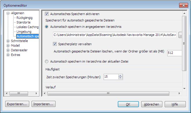 3. Passen Sie die Optionen für Automatisch speichern nach Bedarf an. Wenn Sie beispielsweise möchten, dass Autodesk Navisworks alle 20 Minuten eine Sicherungsdatei von einer größeren Dateiänderung speichert, geben Sie in das Feld Zeit zwischen Speicherungen (Minuten) die Zahl 20 ein.
