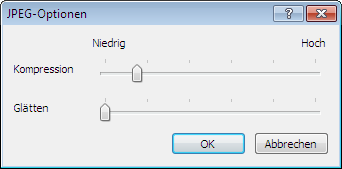 Klicken Sie für das Dateiformat JPEG auf die Schaltfläche Optionen, und verwenden Sie das Dialogfeld JPEG-Optionen, um die Einstellungen für Kompression und Glättung festzulegen.