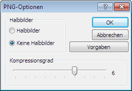 Klicken Sie für das Dateiformat PNG auf die Schaltfläche Optionen, und verwenden Sie das Dialogfeld PNG-Optionen, um die Einstellungen für Halbbilder und Kompression festzulegen.