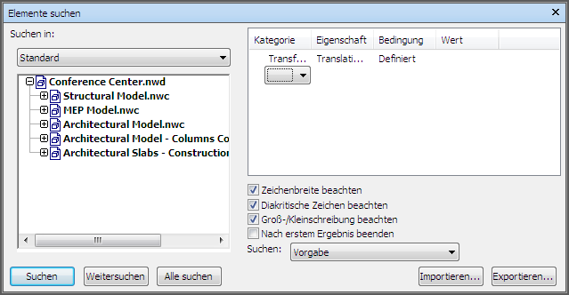 Alle Kategorien und Eigenschaften bestehen aus zwei Teilen: einer auf der Benutzeroberfläche von Autodesk Navisworks angezeigten Benutzerzeichenfolge und einer nicht sichtbaren internen Zeichenfolge, die hauptsächlich von der API genutzt wird. Vorgabemäßig bedarf es einer Übereinstimmung beider Teile; Sie können bei Bedarf aber auch angeben, dass nur ein Teil übereinstimmen muss. Autodesk Navisworks So können Sie beispielsweise Benutzernamen aus der Suche ausklammern und die Übereinstimmungen auf die internen Namen der Elemente beschränken. Das ist etwa dann sinnvoll, wenn Sie Ihre gespeicherten Suchvorgänge mit Benutzern lokalisierter Versionen von Autodesk Navisworks gemeinsam verwenden möchten.