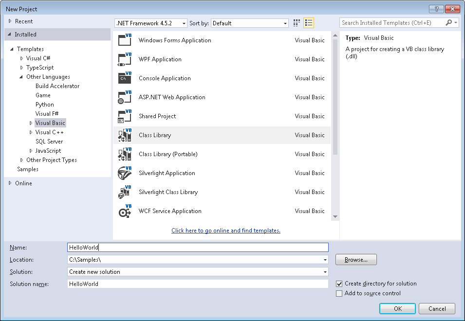 - In the right-hand frame, select Class Library. This example assumes that your project location is: C:\Samples.