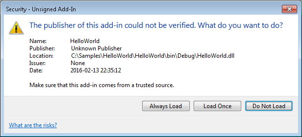 If an add-in is not digitally signed with a certificate issued by a trusted certificate authority, Revit pops up a dialog when opening asking the user to confirm if he/she wants to load the application. The figure below shows an example of the security warning dialog when an unsigned add-in is detected. The user is presented with choices of: 1) allowing the same add-in to always load from now on, 2) load only this time and ask again next time, and 3) do not allow to load the add-in.