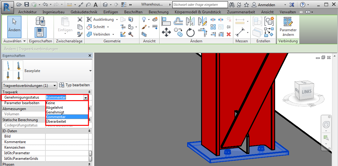 Der für die Stahlverbindungen festgelegte Genehmigungsstatus wird ebenfalls zwischen Revit und Advance Steel übertragen und synchronisiert.