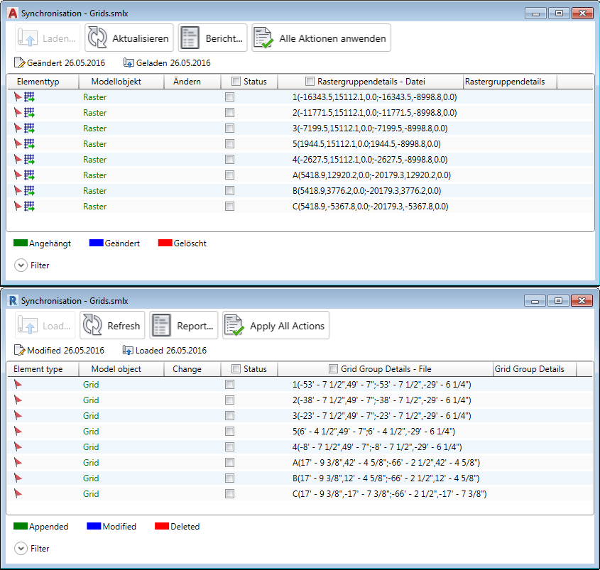 Im Dialogfeld Synchronisation wird jede Rasterachse in einer eigenen Zeile angezeigt (Geändert, Angehängt oder Gelöscht).
