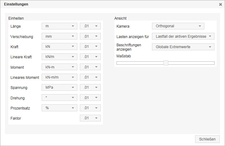 Einstellungen öffnen, um das Dialogfeld Einstellungen zu öffnen, in dem Sie die Einstellungen für die Einheiten der in der Ansicht angezeigten Ergebnisse und andere Einstellungen für das Modell und die Ergebnisse angeben können.