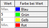 Standardmäßig sind Farb-Wert-Paare für Maximal- und Minimalwerte vorgegeben. Diese Werte sind relativ zu den angezeigten Daten. Sie können nur die Farben für die Minimal- und Maximalwerte (Min./Max.) festlegen. Diese Farb-Wert-Paare können nicht gelöscht werden.