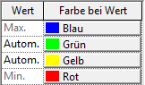 Beim Hinzufügen eines neuen Farb-Wert-Paars zu den Vorgaben für den Maximal- und Minimalwert wird automatisch die Farbe zugewiesen, die (linear in RGB) genau in der Mitte zwischen den benachbarten Farben liegt. Der genaue Zahlenwert für den automatischen Wert ist in Abhängigkeit von den Analyseergebnissen unterschiedlich, wie die folgende Tabelle zeigt: