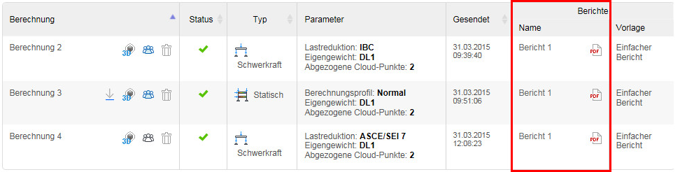 Ergebnisse sind in Form von vordefinierten Berechnungsberichten auf der Autodesk® 360 Structural Analysis-Website verfügbar. Sie können sie in den Formaten HTML oder PDF anzeigen. Sie können sie auch herunterladen und lokal speichern.