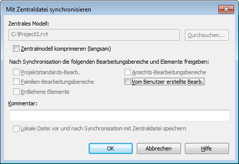 (Bearbeitungsanforderungen), um das Dialogfeld Bearbeitungsanforderungen zu öffnen. Wenn Sie die Synchronisation mit der zentralen Projektdatei ausführen, werden entliehene Elemente automatisch freigegeben. Sie können die entliehenen Elemente behalten, indem Sie im Dialogfeld Mit Zentraldatei synchronisieren die Option Entliehene Elemente deaktivieren.