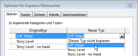 | Verhindern, dass Revit Elemente eines bestimmten Typs kopiert | Suchen Sie den Elementtyp in der Spalte Originaltyp. Wählen Sie in der Zeile für diesen Elementtyp in der Spalte Neuer Typ die Option Diesen Typ nicht kopieren. |