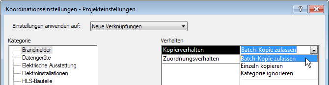 Geben Sie vor oder beim Kopieren von Installationen aus einem verknüpften Modell in ein MEP-Modell im Dialogfeld Koordinationseinstellungen ein Kopierverhalten für jede Installationskategorie an.