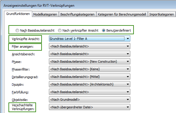 Um die Verwendung von Filtern für verknüpfte Modelle in einer Basisbauteilansicht zu steuern, verwenden Sie die Einstellungen im Dialogfeld Anzeigeeinstellungen für RVT-Verknüpfungen.