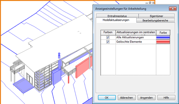 Sie können in der Anzeige sehen, welche Elemente in einem Modell mit Arbeitsteilung im zentralen Modell aktualisiert oder daraus gelöscht wurden.