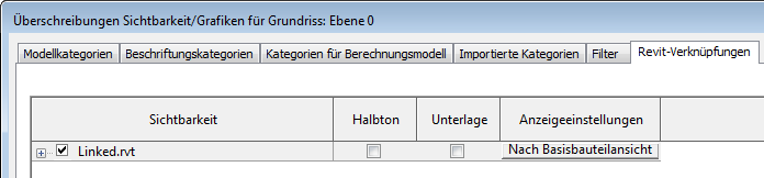 Wenn Nach Basisbauteilansicht nicht angezeigt wird, klicken Sie in die Spalte Anzeigeeinstellungen. Wählen Sie im Dialogfeld Anzeigeeinstellungen für RVT-Verknüpfungen auf der Registerkarte Grundfunktionen die Option Nach Basisbauteilansicht, und klicken Sie auf OK.