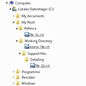 Daraufhin sind alle ursprünglichen absoluten Pfade nicht aufgelöst, da sie auf einen bestimmten Speicherort verweisen. Der relative Pfad zu file_01.rvt ist ebenfalls unterbrochen, da sich die Datei nicht innerhalb des Arbeitsverzeichnises befunden hat und darum nicht mit dem Arbeitsverzeichnis verschoben wurde.