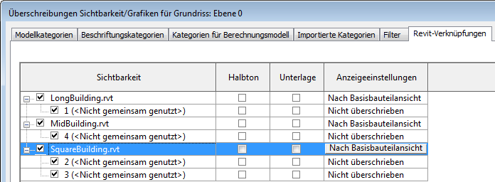 Anzeigeeinstellungen: Optionen zum Überschreiben weiterer Einstellungen für die einzelnen verknüpften Modelle in der aktuellen übergeordneten Ansicht. Auf der Schaltfläche in dieser Spalte wird die momentan festgelegte Anzeigeeinstellung angezeigt (Nach Basisbauteilansicht, Nach verknüpfter Ansicht oder Benutzerdefiniert).