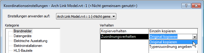 Geben Sie vor oder beim Kopieren von Installationen aus einem verknüpften Modell in ein MEP-Modell für jede Installationskategorie im Dialogfeld Angeben von Koordinationseinstellungen ein Zuordnungsverhalten an.