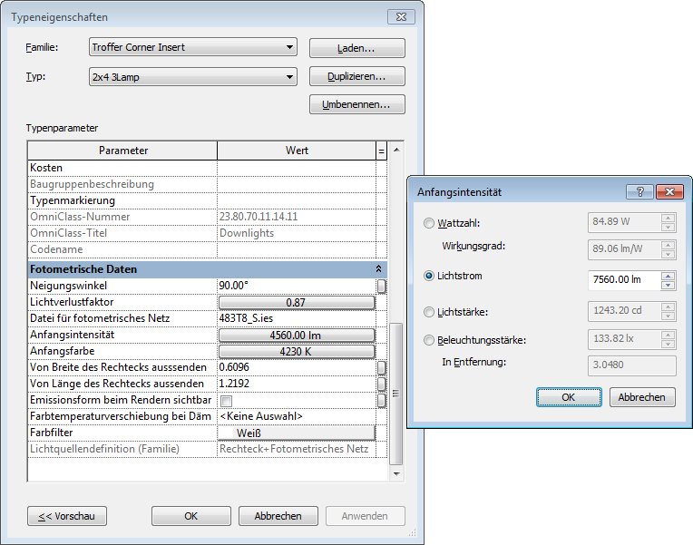 Die Anfangsintensität und der Lichtverlustfaktor sind Typeigenschaften des jeweiligen Leuchtentyps. Auf diese Eigenschaften können Sie im Dialogfeld Typeneigenschaften der jeweiligen Leuchte zugreifen.