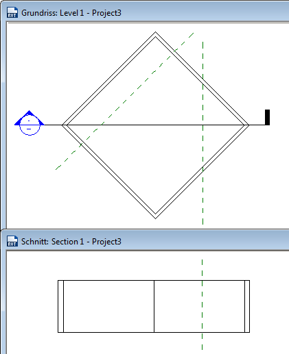 Beispiel: Der folgende Grundriss enthält zwei Referenzebenen, die durch gestrichelte grüne Linien angezeigt werden. Die Referenzebene links schneidet die Schnittlinie in einem Winkel. Die Referenzebene rechts steht lotrecht zur Schnittlinie. Da die erste Referenzebene nicht im rechten Winkel zur Schnittlinie steht, wird diese Ebene in der entsprechenden Schnittansicht nicht dargestellt. Die lotrechte Referenzebene wird dagegen in der Schnittansicht angezeigt.