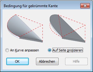 Das Werkzeug Bedingung für gekrümmte Kante ist ein zusätzliches Werkzeug speziell für gekrümmte Kanten. Es legt fest, dass sie eine flache Oberfläche auf die Kante projizieren oder eine gekrümmte Oberfläche, die der Bogenkante der Geschossdecke entspricht.