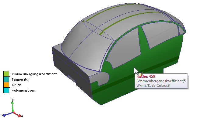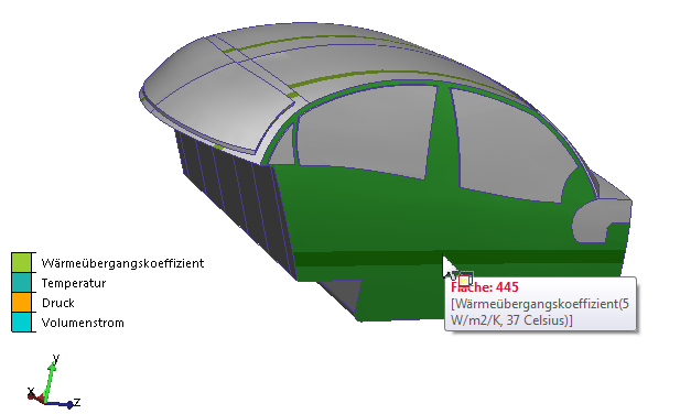 Anmerkung: Dieser Analyse liegt ein Worst-Case-Szenario für die Wärmeübertragung an die Umgebungsluft zugrunde. Eine umfangreichere und genauere Studie des Wärmeverlustes an die Umgebung ist in Autodesk® CFD möglich. Dies erfordert eine Modellierung der das Fahrzeug umgebenden Luft. Häufig ist diese Modellierung nicht erforderlich und die in diesem Fall vorgenommene konservative Schätzung, die ein Worst-Case-Szenario in einer wesentlich kürzeren Zeit liefert, ist ausreichend. Die gesparte Zeit kann für Vergleiche von alternativen Designs genutzt werden.