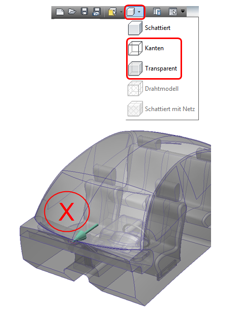 11. Ändern Sie das Modellerscheinungsbild wieder auf Schattiert, und drehen Sie das Modell. Wählen Sie die beiden Bogenflächen hinten im Innenraum aus. Klicken Sie im kontextabhängigen Werkzeugkasten auf die Schaltfläche Bearbeiten.