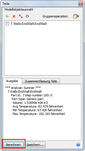 14. Um die Temperatur der Luft zu berechnen, wählen Sie das Fahrgastraum-Luftvolumen aus. Klicken Sie im Auswahlfenster Teile auf die Schaltfläche Berechnen, führen Sie einen Bildlauf nach unten zur letzten Iteration durch und beachten Sie die Durchschnitts-, Maximal- und Minimaltemperaturen: