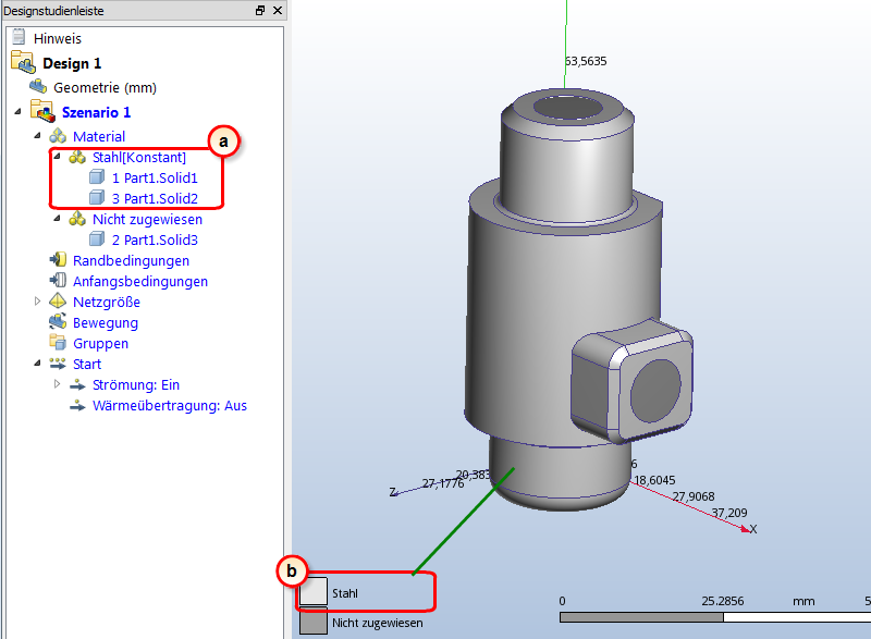 a. Überprüfen Sie in der Designstudienleiste, ob die Materialzuweisung für die beiden Stahlteile korrekt ist.