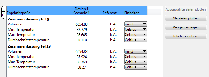 Anhand der Ergebnisteile kann die Temperatur eines ausgewählten Teils schnell ermittelt werden. Um die Ergebnisse mehrerer Teile zu vergleichen, definieren Sie diese als Zusammenfassungsteile, und zeigen Sie deren Ergebnisse auf der Registerkarte "Kritische Werte" der Ausgabeleiste an.