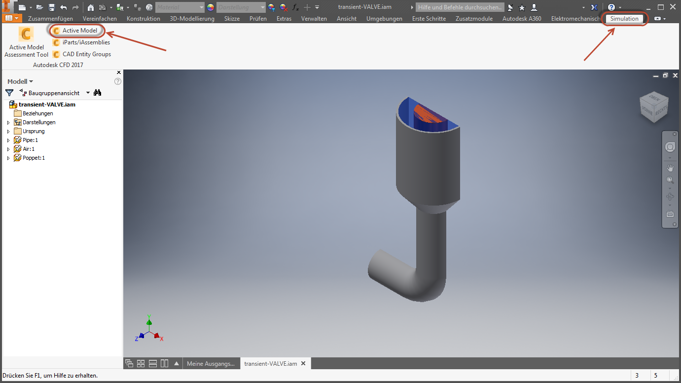 Wenn Sie das Modell z. B. aus Autodesk® Inventor heraus starten, klicken Sie auf Simulation und Aktives Modell:
