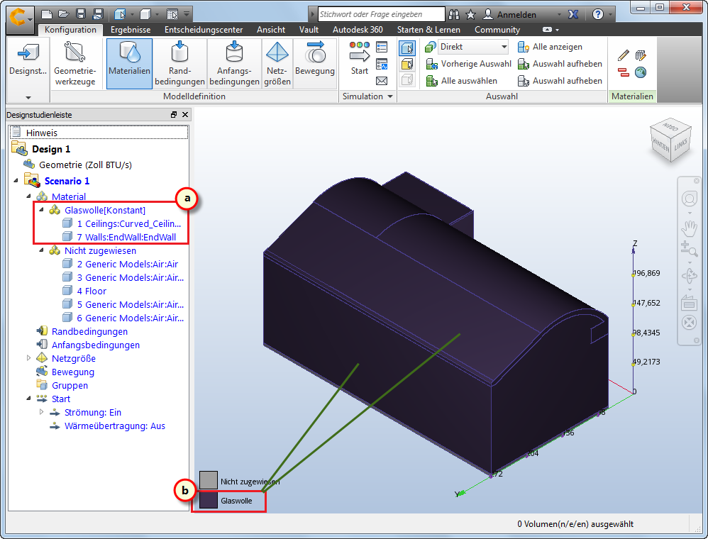 6. In der Designstudienleiste können Sie anhand der Teilfarbe überprüfen, ob das Material Glaswolle korrekt zugewiesen wurde: