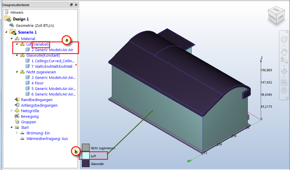 9. In der Designstudienleiste können Sie anhand der Teilfarbe überprüfen, ob das Material Luft korrekt zugewiesen wurde.