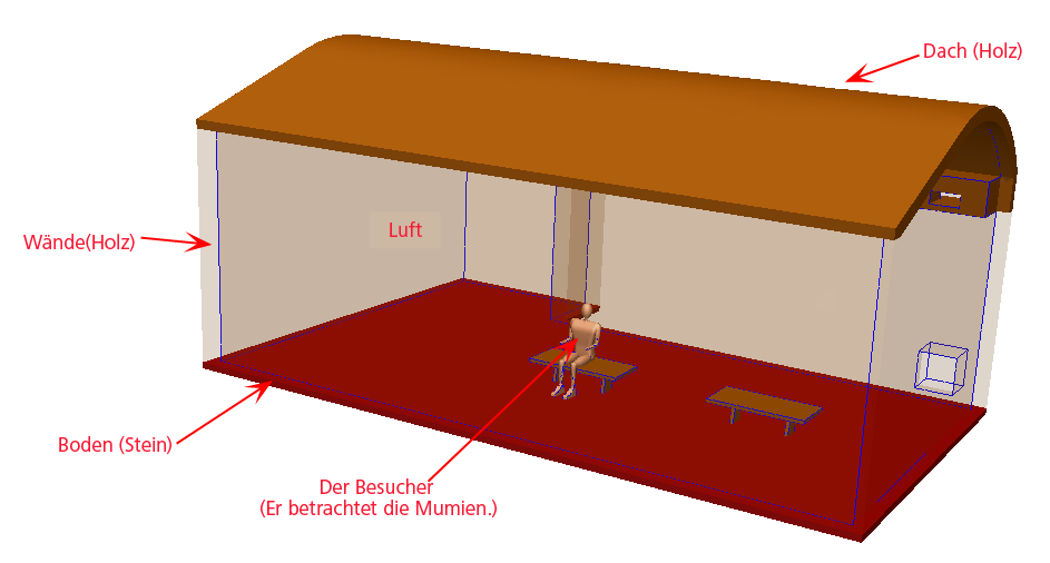 Die Ausstellungshalle ist ein offenes Atrium mit isolierten Wänden und isoliertem Dach, einem Steinfußboden, zwei Bänken und einem Besucher, der auf der Bank sitzt (er besucht die Mumienausstellung, während seine Frau und Kinder sich im Geschenkartikelladen aufhalten).