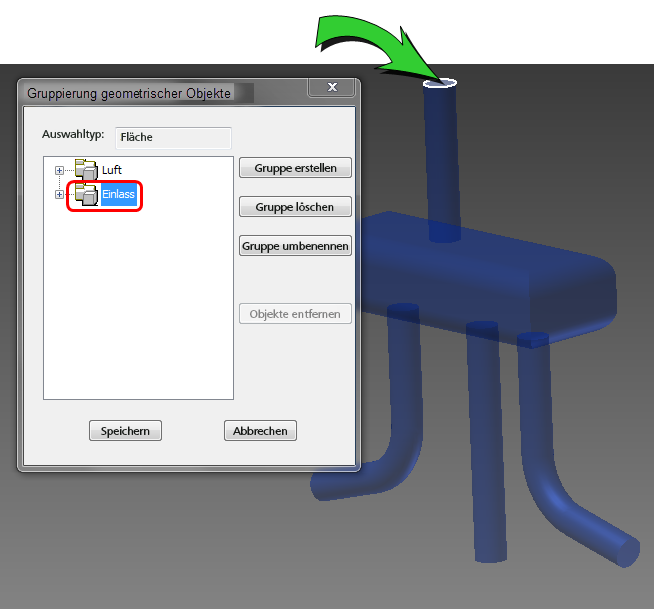 Wählen Sie Flächen. Geben Sie "Einlass" als Gruppennamen ein.