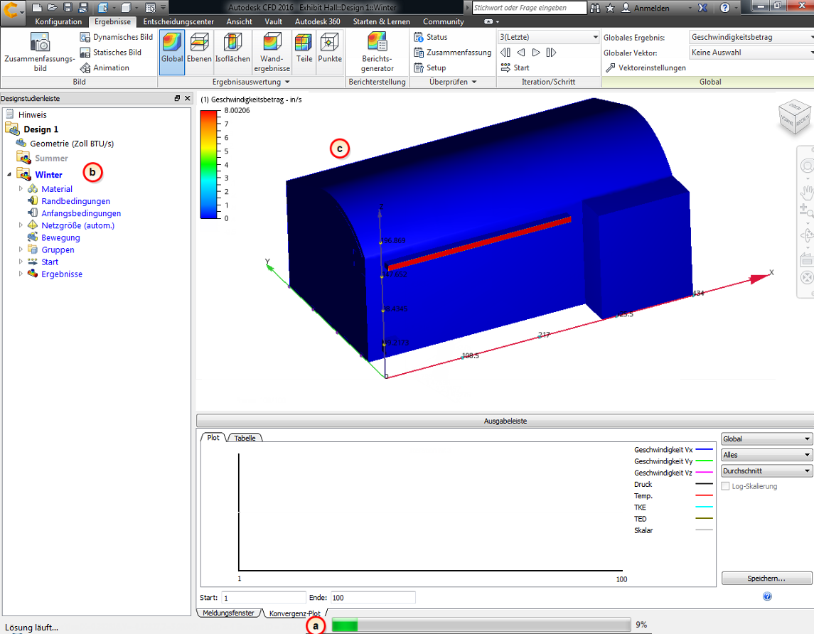 - c. Autodesk® CFD zeigt die Ergebnisse der Berechnung an.